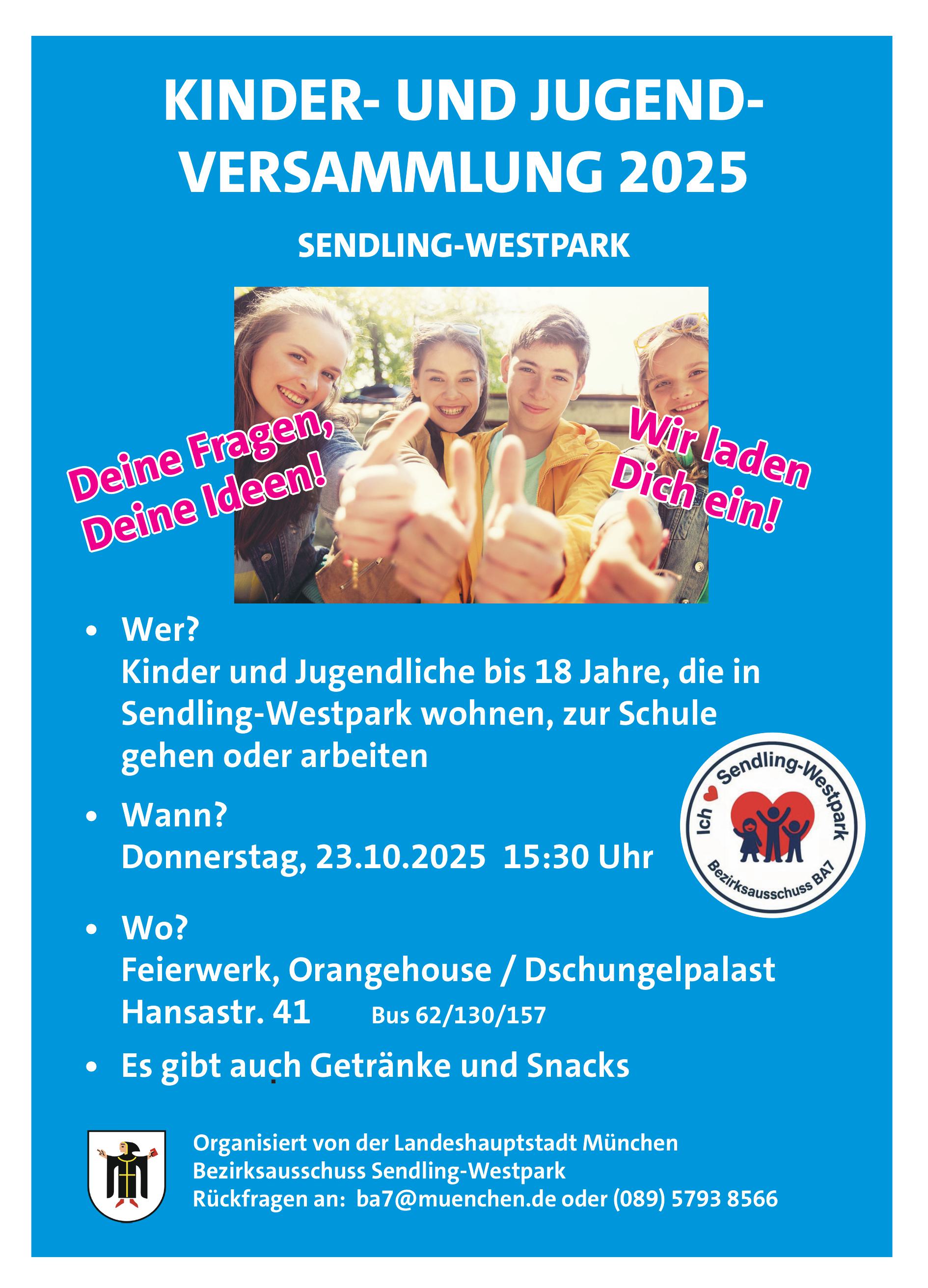 Kinder und Jugendliche bis 18 Jahren, die im Stadtbezirk Sendling-Westpark wohnen, zur Schule gehen oder arbeiten, können in der Kinder und Jugendversammlung einzeln, als Gruppe oder als Schulklasse ihr Anliegen vortragen und Anträge stellen. Alle Anträge, die in der Versammlung mit Mehrheit beschlossen werden, werden vom Bezirksausschuss übernommen und an die zuständigen Stellen adressiert.