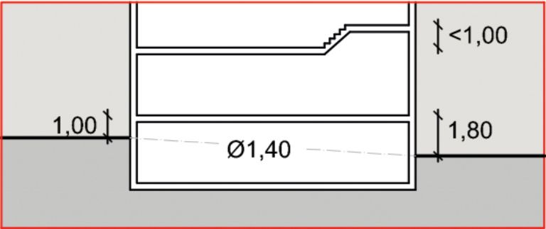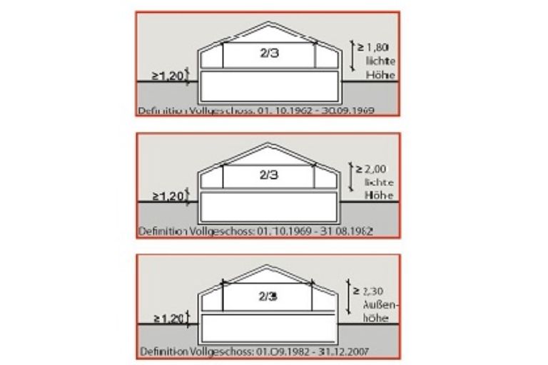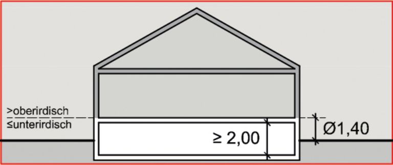 Geschosse sind oberirdische Geschosse, wenn ihre Deckenoberkanten* im Mittel mehr als 1,40 Meter über die Geländeoberfläche hinausragen; im Übrigen sind sie Kellergeschosse. Eine versetzte Ebene eines Raumes oder eines Geschosses ist dann ein neues Geschoss, wenn die Höhendifferenz 1 Meter oder mehr beträgt; liegt dagegen die Höhendifferenz unter 1 Meter, besteht kein neues Geschoss.