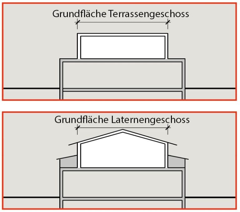 Terrassengeschosse / Staffelgeschosse und Laternengeschosse werden in der BayBO nicht definiert. Sie sind grundsätzlich oberste Geschosse, die gegenüber den Außenwänden des Gebäudes zurückgesetzt sind. Terrassen- und Staffelgeschosse sind hinsichtlich ihrer Begrifflichkeit gleichzusetzen. In der Regel sind Terrassengeschosse Vollgeschosse und werden als solche angerechnet. Die Anrechnung der Grundfläche von Laternengeschossen erfolgt analog den Terrassengeschossen.