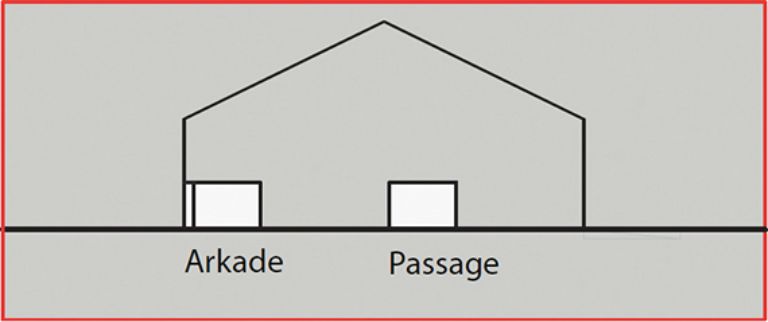 Arkaden und Passagen sind Teil des Geschosses, wenn sie überdeckte, an zwei Seiten offene Durchgänge (Passagen) oder überdeckte Gänge, an bis zu drei Seiten offen und dabei an einer Seite von Säulen begrenzt (Arkaden), sind. Die Fläche ist somit begrenzt und Teil eines Raumes. Sie kann auch öffentlich gewidmet sein.