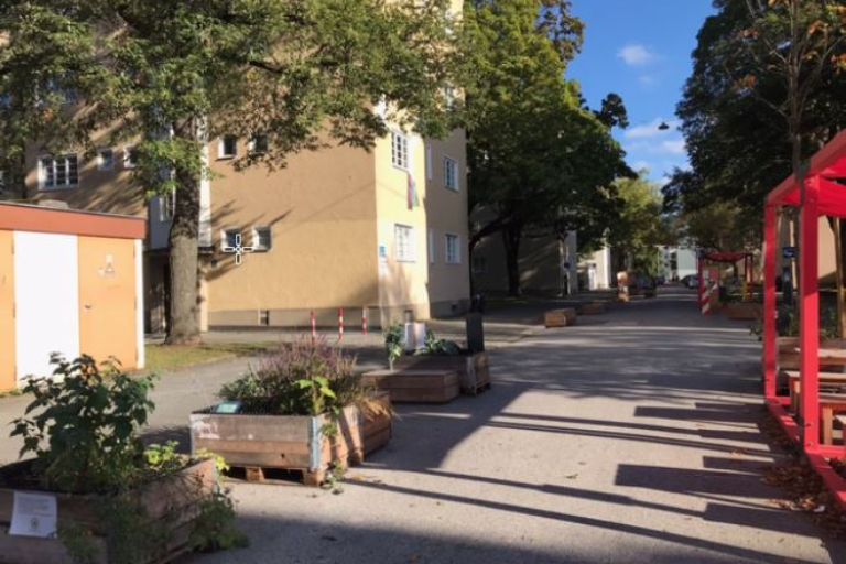 Man hatte die gute Absicht eine Untersuchung zu leiten, wie der Autoverkehr in der Stadt verringert werden und zugleich Lebensqualität für die Bevölkerung verbessert werden kann. Ein Teil der Straße wurde gesperrt für die Autofahrer und Parker. Es wurden Hochbeete und Sitzmöbel aufgestellt und zwei Mobilitätspunkte zum Ausleihen von E-Rollern und E-Bikes eingerichtet. Dazu Carsharing. Für die Entfallenen Parkplätze wurden an anderer Stelle Parkplätze zur Verfügung gestellt.