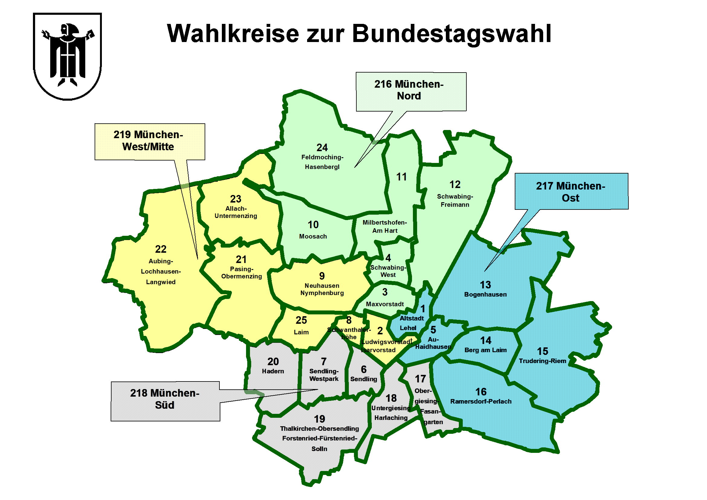 Das Stadtgebiet von München ist zur Bundestagswahl in vier Wahlkreise aufgeteilt. Der Zuschnitt ist seit der Bundestagswahl 2021 gleich geblieben - nur die Nummerierung der Wahlkreise hat sich verändert.