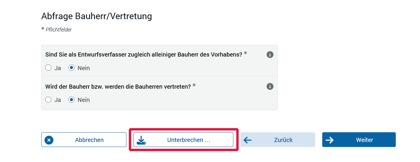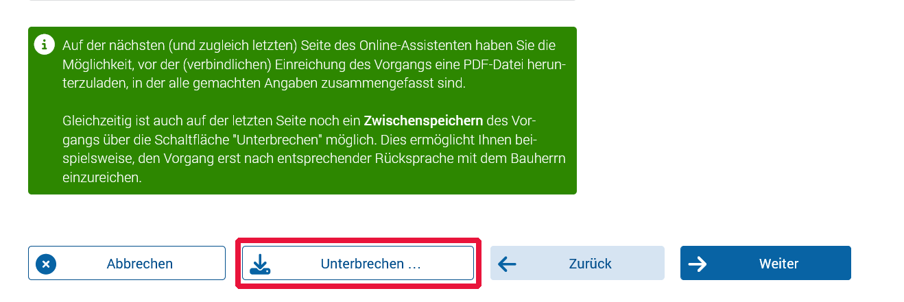 • Beim Ausfüllprozess kann auf jeder Seite der Online-Assistenten zwischengespeichert werden. Dabei ist auf die Schaltfläche „Unterbrechen“ zu klicken: Screenshot