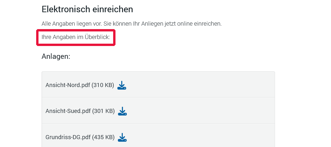 • Besonders wichtig ist, dass das auch noch auf der letzten Seite des Online-Assistenten funktioniert, auf dem bereits das zusammenfassende Antrags-PDF mit allen gemachten Angaben heruntergeladen werden kann: Screenshot