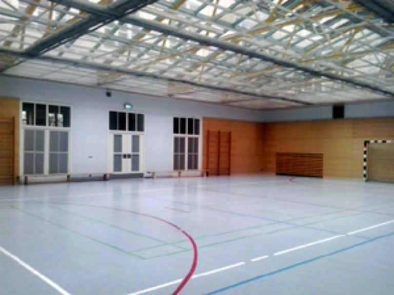 Den Abschluss des Baukörpers bildet die Dreifachsporthalle. Diese soll unabhängig vom Schulbetrieb auch von ortsansässigen Vereinen genutzt werden und bietet daher Tribünenplätze für 500 Personen.