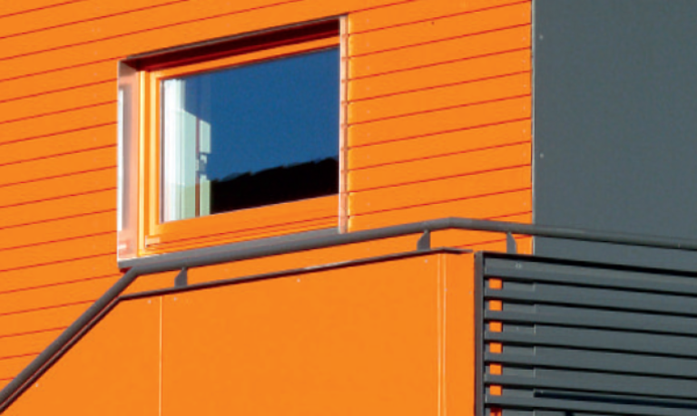 Je nach Sonnenstand verändern die schrägen Außenwände die Farbigkeit der holzverschalten orangefarbenen Nord-, West und Ostfassade, die aus energetischen Gründen weitgehend geschlossen wurden. Großflächig hingegen öffnet sich die Südseite der Krippe auf einen Freibereich. Sinnvoll wurden die Gruppenräume, die sich auf zwei Geschossen übereinander reihen, auf die „Sonnenseite“ ausgerichtet, während Personal- und Sanitärräume sowie Garderoben mit eher geschlossenen Wandflächen auskommen.