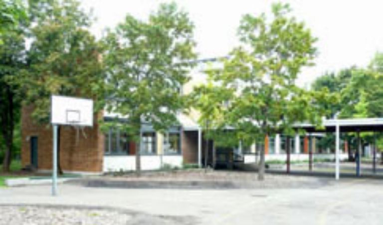 Durch die Gliederung in sieben ablesbare Baukörper sowie den vorgelagerten, eingeschossigen Verwaltungstrakt mit Werkhof an der Markgrafenstraße integriert es sich gut in die vorhandene Wohnbebauung. Der Pausenhof sowie die Sport- und Spielflächen orientieren sich zum öffentlichen Grünzug.