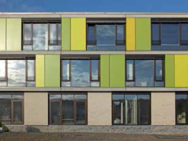In dem Neubau wird das Thema Energie groß geschrieben. Das Haus kommt dank des integralen Architektur- und Energiekonzepts ohne CO2-Emissionen aus. Schon bei der Gebäudeform wurde auf ein möglichst geringes Verhältnis von Außenfläche zu Volumen geachtet. Kern des Hauses ist die atriumartige Halle mit Galerieerschließung, eingestellter Treppe und großzügigem Licht von oben. Das markante Orange der Fassade spiegelt sich im Inneren des Gebäudes im Kunstprojekt „Glong“ wider. Nach den Plänen des Künstlers Wolfgang Stehle wurden dazu gefährliche Kanten mit lustigen orangen Polstern entschärft.