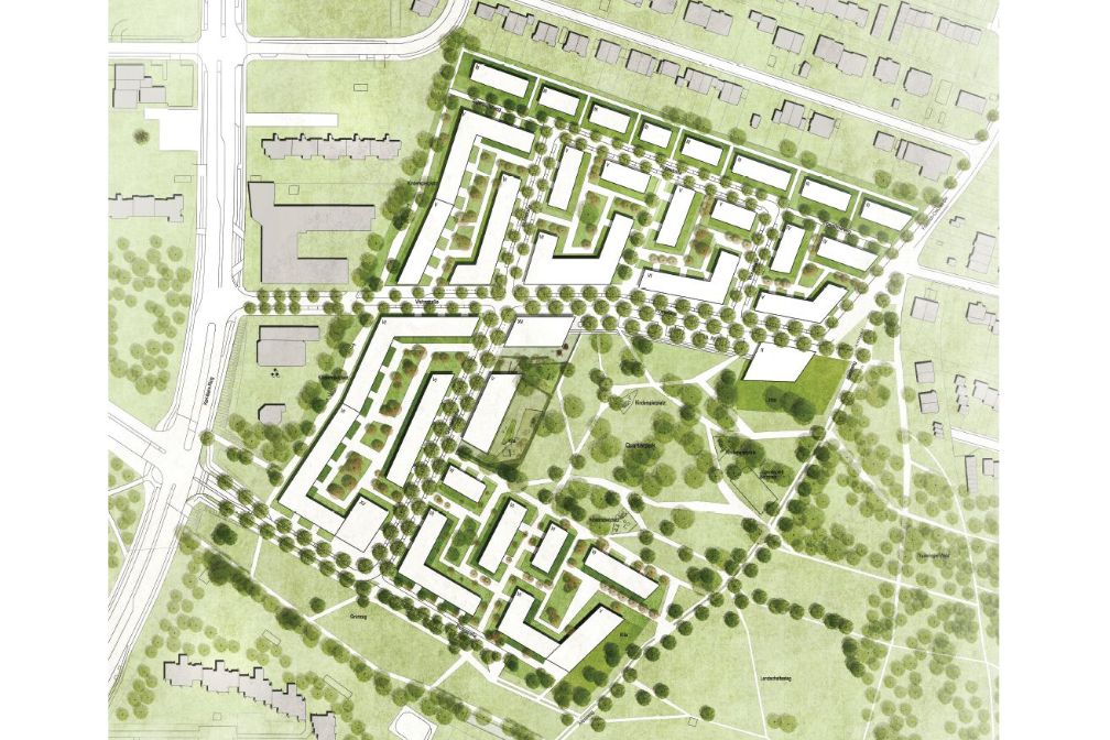 Neben den Wohnungen werden drei Kindertagesstätten, Einzelhandel sowie Grün- und Freiflächen entstehen.