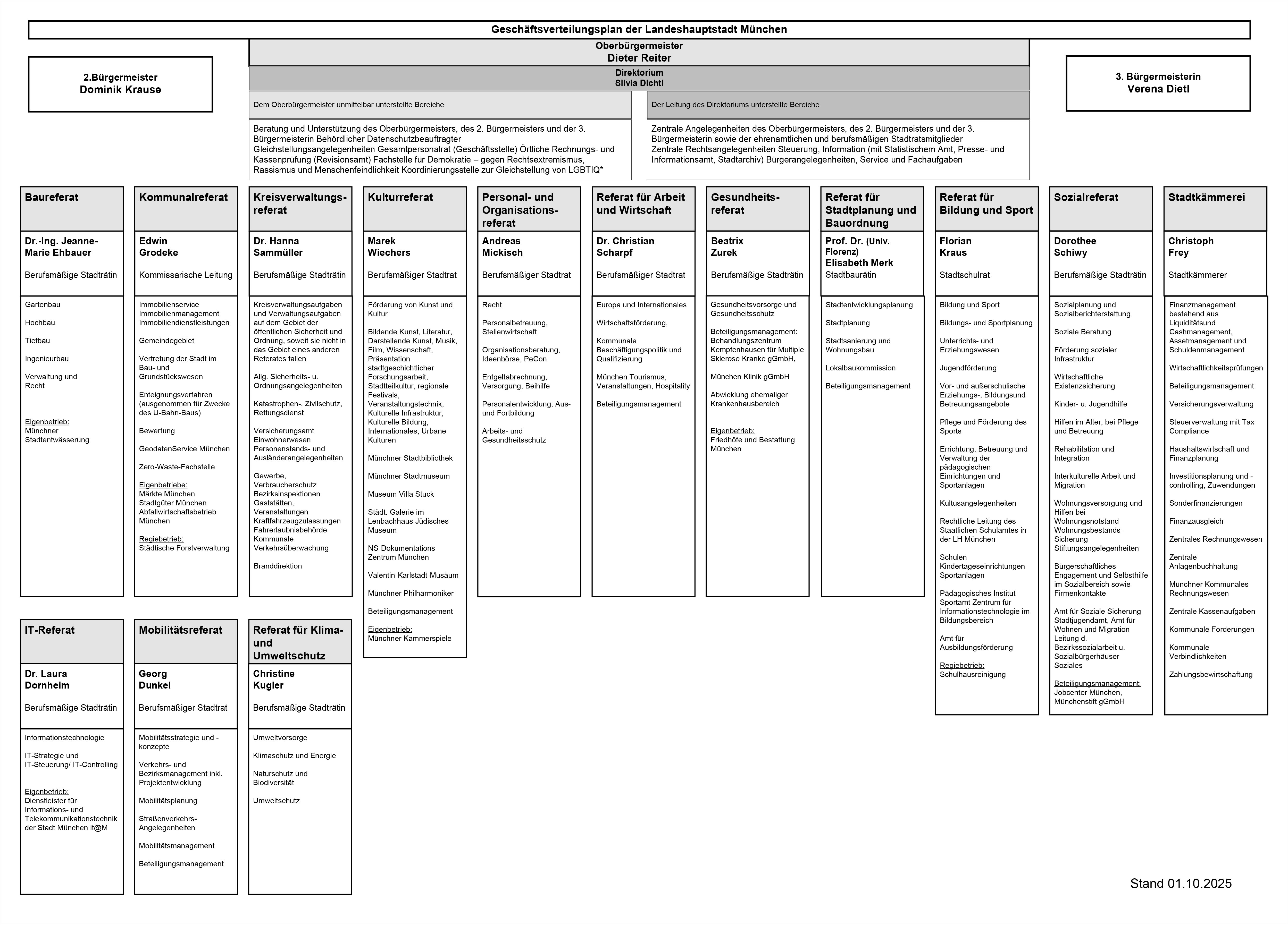 Geschäftsverteilungsplan Geschäftsverteilungsplan der Landeshauptstadt München (Stand: 1. September 2025) Download-Bereich Geschäftsverteilungsplan der LH München PDF - 88 KB Organ. Chart of the City of Munich PDF - 104 KB Geschäftsverteilungsplan (jpg) JPG - 1 MB