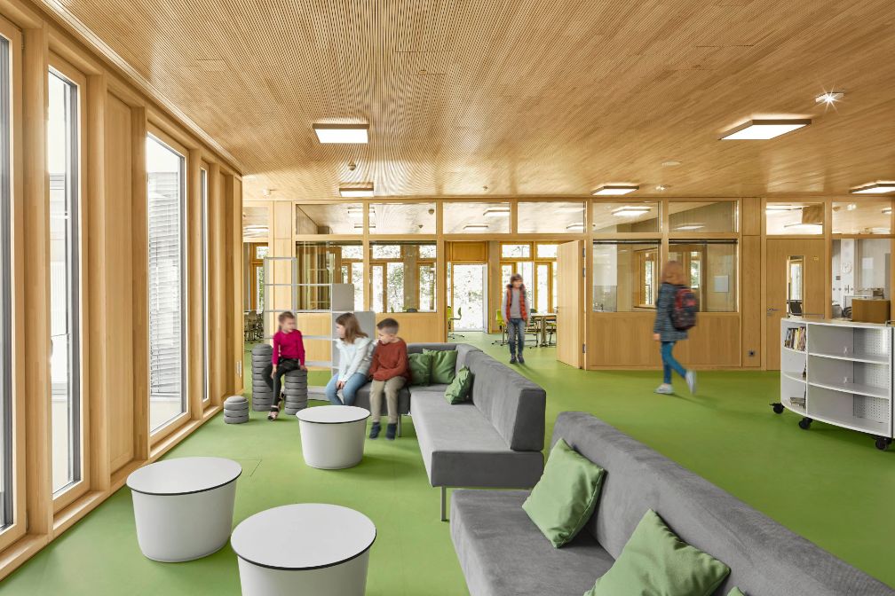 In Kombination mit Holzwandvertäfelungen, Echtholzdecken und den grünen Bodenbelägen konnte das Baureferat für die Lernhäuser eine ruhige, naturnahe Gestaltung umsetzen. Die Dachfläche des Gebäudes ist extensiv begrünt und zusätzlich mit einer flächenmaximierten Photovoltaikanlage ausgestattet.