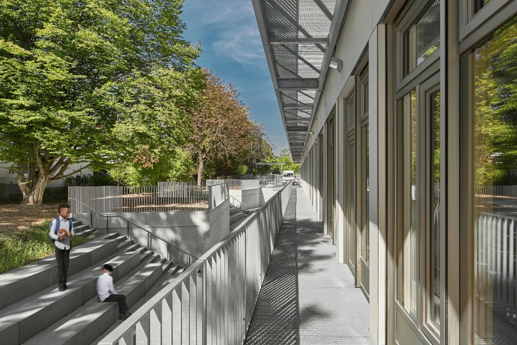 Der Pausenhof zwischen Schule und Haus für Kinder schafft Synergien. Er dient auch als Eingangsbereich der Schule. Das Schulgebäude mit seinem durchlässigen Erdgeschoss verbindet den Pausenhof und die Sportfreiflächen. Die Gebäude und Freiräume liegen entlang eines nördlichen Erschließungswegs, der dem Grundstückszuschnitt entspricht.