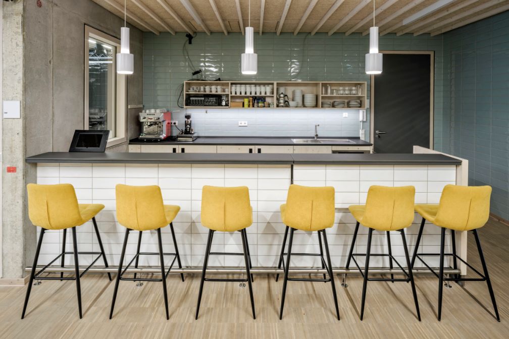 zwei Hortgruppen befinden sich in den beiden Obergeschossen und verfügen über Gruppen- und Hausaufgabenräume, eine Werkstatt, Personalräume und eine Küche. Fast 400 Quadratmeter Terrasse stehen den Kindern der beiden Hortgruppen zum Toben und Spielen zur Verfügung. Die Terrasse im zweiten Obergeschoss ist mit Kunstrasen ausgelegt. Das Gebäude ist mit einer Photovoltaikanlage ausgestattet