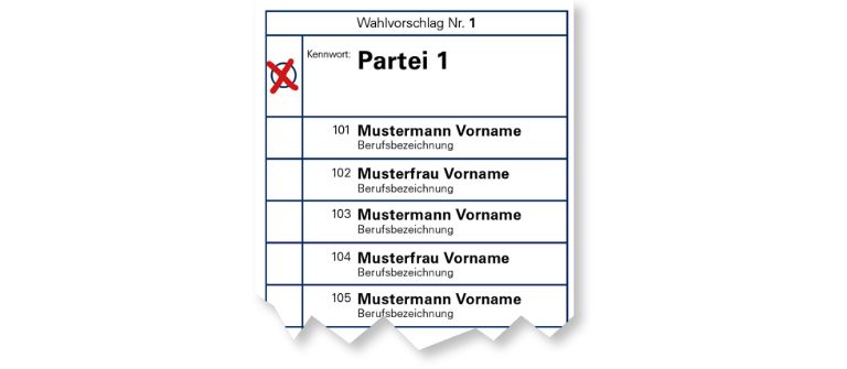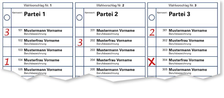Wenn Sie Ihre Stimmen nicht frei verteilen wollen, können Sie auch einfach einen kompletten Wahlvorschlag ohne Änderungen annehmen. Dazu machen Sie ein sogenanntes Listenkreuz ganz oben in den Kreis neben den Namen der Partei oder Wählergruppe. Die Stimmen werden dann in der nummerierten Reihenfolge an die Personen auf der angekreuzten Liste verteilt, bis die Gesamtstimmenzahl aufgebraucht ist. Personen, die dort dreimal aufgeführt sind, erhalten drei Stimmen. Personen, die dort zweimal aufgeführt sind, erhalten zwei Stimmen.