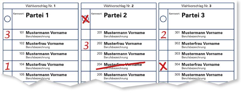 Auch eine Mischform ist möglich: Sie können eine Liste wählen (mit und ohne Änderungen) und zusätzlich noch Stimmen frei verteilen, indem Sie einzelnen Personen von anderen Parteien und Wählergruppen bis zu drei Stimmen geben. Bei der Auszählung werden immer zuerst die frei verteilten Stimmen an die Einzelpersonen zusammengezählt. Die restlichen Stimmen bekommt dann die Partei oder Wählergruppe mit dem Listenkreuz. Dort werden sie an die Personen in der nummerierten Reihenfolge verteilt, bis alle Reststimmen aufgebraucht sind.
