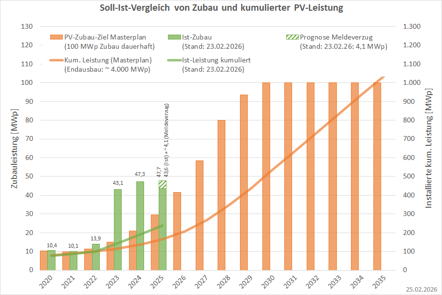 Der Vergleich zwischen Plan und Realität (Soll-Ist-Vergleich) beim Ausbau der Photovoltaikanlagen zeigt, dass die Ziele für 2023, 2024 und auch 2025 deutlich übertroffen wurde.