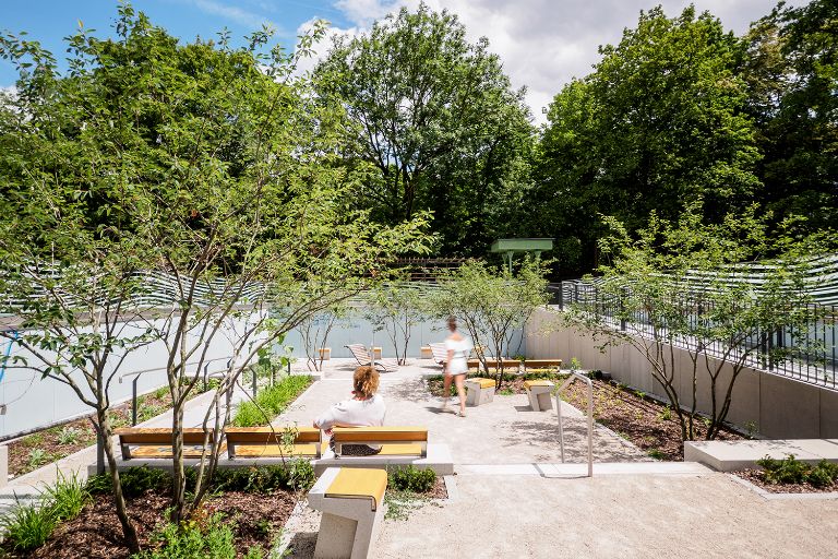 Ist der Brunnen nicht in Betrieb, ist er Teil der begehbaren Platzfläche. Unter den Bäumen, die den Platz einfassen, laden Sitzbänke zum Verweilen ein. Als Teil des Gesamtkonzeptes wurde auch das Parkmobiliar von den Landschaftsarchitekt*innen entworfen.
