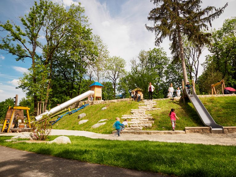 Der neue Geländespielplatz beim Franz-Eigl-Weg nutzt die Höhenunterschiede der Hangkante und regt unter dem Motto „Burgruine“ zu fantasievollen Spielen an. Neben dem Bolzplatz liegt im Tal der Burggraben, der mit einem Floß oder über Kletter- und Sprungsteine und schmale Stege überwunden werden kann. Der Burghang wird über Rutschen und Belagerungstreppen bezwungen. Der Burghof bietet einen multifunktional nutzbaren Raum zwischen den Ruinenmauern und Burgtürmen, von denen Ausschau gehalten oder mit Rutschen die Burg wieder verlassen werden kann. Bewacht wird die Burg von einem Drachen. Die Drachenskulptur aus unterschiedlich hohen gebogenen Metallrohren schlängelt sich durch die Wiese und verbindet den Abenteuerspielplatz mit einem Spielbereich für kleinere Kinder, der mit einer Spielkombination, Sandspiel und Nestschaukel ausgestattet ist.
