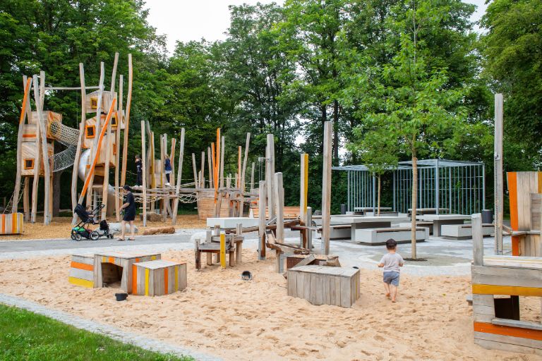 Auf einer Waldlichtung im Westen entstand ein attraktiver Spielbereich mit einem vielfältigen Angebot für Kleinkinder und Kinder bis zwölf Jahre. Die bestehenden Wege wurden saniert und durch einen weiteren Weg in Verlängerung zum Hauptweg ergänzt. Der Spielbereich gliedert sich in drei altersdifferenziert gestaltete Bereiche. Jedem Spielbereich sind Aufenthaltsbereiche für Eltern oder Begleitpersonen zugeordnet. Bank-Tisch-Kombinationen bieten dort auch die Möglichkeit für ein Picknick am Spielplatz.
