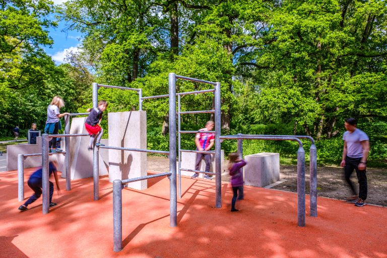 Die beiden Kinderspielbereiche im Osten wurden komplett umgebaut und zu einer gemeinsamen großen Spiellandschaft für Klein- und Schulkinder verbunden. Im Norden entstand ein kleiner Treffpunkt für Jugendliche, Erwachsene und Senior*innen mit einer Tischtennisplatte, Fitnessgeräten und Sitzgelegenheiten.