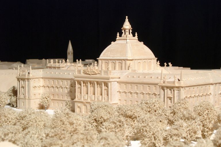 Am Anfang existiert nur ein grober Klotz, die sogenannte Lindenholzbohle. Bevor die Modellbauer*innen mit dem Schnitzeisen oder anderen Werkzeugen daran Hand anlegen, müssen sie eine genaue Idee davon haben, wie das Ergebnis einmal aussehen soll. Dazu müssen Pläne und Fotos besorgt, Bauakten studiert und die Objekte skizziert werden. Manchmal müssen die Mitarbeiter*innen sogar selbst Vermessungen vornehmen. Vielleicht handelt es sich bei der Frau, die gerade auf der Kuppel des Justizpalastes Maß nimmt, ja um eine Modellbauerin!