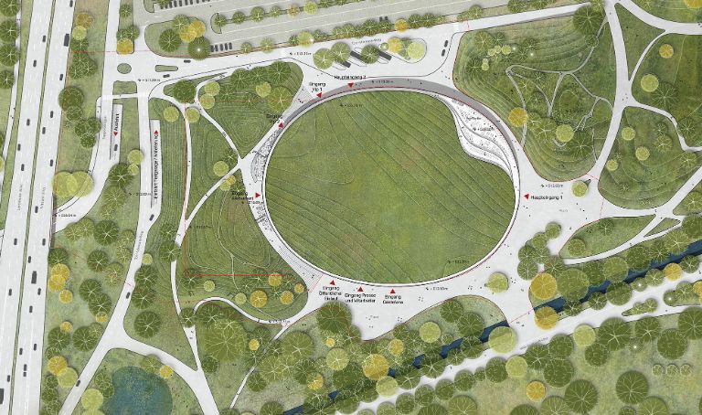 Ein wesentlicher Teil der Wettbewerbsaufgabe lag in der Einbindung der neuen Sportarena in die bestehende Landschaft und darin, angemessene gestalterische Bezüge zum benachbarten Olympiastadion zu schaffen, das mit seinen Zeltdächern den kompositorischen Höhepunkt des Parks darstellt. Hierfür wird die zukünftige Arena eingesenkt und ihre Höhe auf maximal 20 Meter beschränkt, sodass sie sich gut in die bestehende Baumkulisse einfügt.