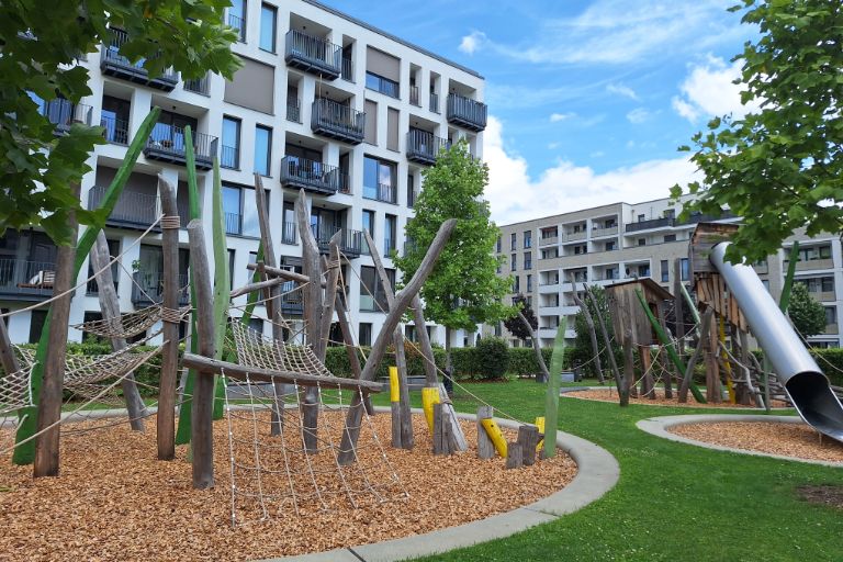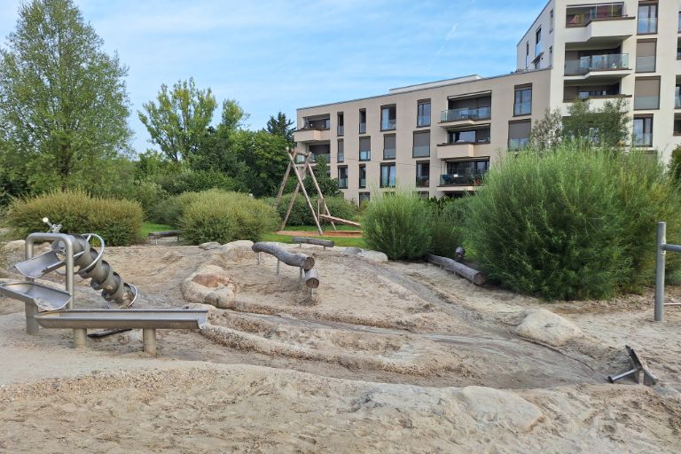 Privater Spielplatz mit multifunktionalen Spielgeräten und Blickbeziehungen zu den umgebenen Wohnungen, Meiller Gärten, RSLA Rainer Schmidt Landschaftsarchitekten