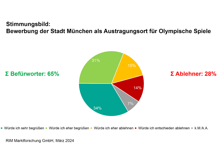 (27.3.2024) Fast zwei Drittel der Münchnerinnen und Münchner würden es begrüßen, wenn sich die Stadt als Austragungsort für Olympische Spiele bewerben würde. Das ist das Ergebnis einer aktuellen Umfrage der RIM Marktforschung GmbH. 64,6% der Befragten stehen einer Münchner Olympiabewerbung positiv gegenüber, nur 28,3% würden sie ablehnen. Keine Meinung hatten 7,1%.