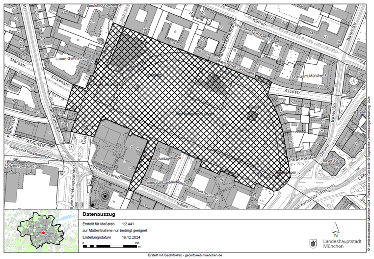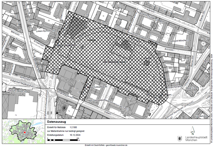 Luisenstraße (entlang der Anwesen Luisenstraße 1 und 5, von der westlichen Gebäudegrenze der Luisenstraße 5 bis zur gegenüberliegenden Gebäudegrenze des Anwesens Elisenstraße 7, entlang der Einfriedung an der Elisen- und Luisenstraße bis Höhe des Anwesens Sophienstraße 26, Gehwege beidseitig), der Eingangsbereich zum Luisengymnasium einschließlich der Stufen zum Eingangsportal (Anwesen Luisenstraße 9), Sophienstraße (einschließlich der Flächen auf dem Anwesen Sophienstraße 28 und der Grünflächen vor den Anwesen Sophienstraße 16, 18 und 24 sowie einschließlich der Arkaden im Bereich des Anwesens Sophienstraße 6 sowie die Gehwege beidseitig), Elisenstraße (zwischen Lenbachplatz und Luisenstraße einschließlich der beidseitigen Gehwege sowie der Treppe zum Justizpalast mit den neben der Treppe befindlichen Grünflächen und der bepflanzten Fläche vor Elisenstraße 3) sowie Luitpoldstraße (zwischen Elisenstraße und Prielmayerstraße, einschließlich Kreuzungsbereich Luitpoldstraße und Prielmayerstraße).