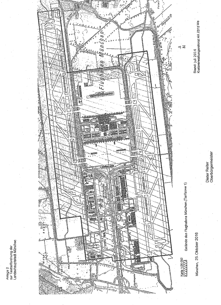Das Gelände des Flughafens im Sinne dieser Verordnung beginnt an der Zufahrt über die Zentralallee 400 m nach der Abzweigung von der Bundesstraße B 301, an der Zufahrt über die Freisinger Allee bei der Agip-Tankstelle und an der Zufahrt über die Staatsstraße 2584 aus Richtung Erding bei der Abzweigung zur „Allgemeinen Luftfahrt“. Die genauen Grenzen des Geländes des Flughafens im Sinne dieser Verordnung ergeben sich aus dem Maßstab 1 : 25.000, ausgefertigt am 25.10.2016, die als Anlage 2 zur Taxitarifordnung Bestandteil dieser Verordnung ist.