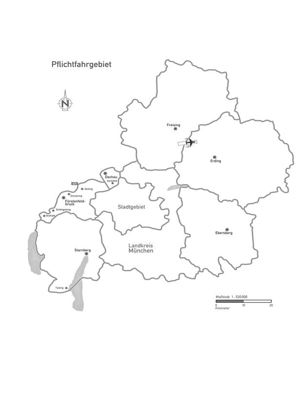 d) die im Landkreis Fürstenfeldbruck südöstlich der B 471 liegen sowie die Gebietsteile der Ortschaften Schöngeising, Grafrath, Fürstenfeldbruck, Emmering und Olching, welche von der B 471 getrennt werden und nord-westlich dieser Grenze liegen. Nur in den Ortschaften Schöngeising, Grafrath, Fürstenfeldbruck, Emmering und Olching ist auch die B 471 dem Pflichtfahrgebiet zuzuordnen.