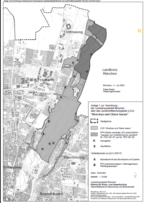 (2) Die Grenzen des Landschaftsschutzgebietes sind in einer Karte, Maßstab 1 : 25.000, ausgefertigt am11. Juli 2024, die als Anlage 1 Bestandteil dieser Verordnung ist, grob dargestellt. Die genauen Grenzen des Landschaftsschutzgebietes ergeben sich aus zwei Karten, Maßstab 1 : 5.000, die als Anlage 2, ausgefertigt am 02.08.2013, und als Anlage 3, ausgefertigt am 11. Juli 2024, Bestandteil dieser Verordnung sind und auf die Bezug genommen wird. Maßgebend für den Grenzverlauf ist hier die Außenkante der grün angelegten bzw. unterlegten Fläche. Die Karten werden bei der Landeshauptstadt München, Referat für Klima- und Umweltschutz - Untere Naturschutzbehörde - archivmäßig aufbewahrt und sind während der Dienststunden allgemein zugänglich.