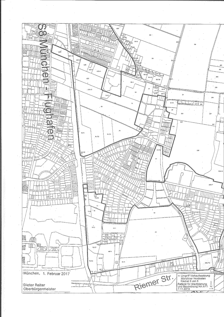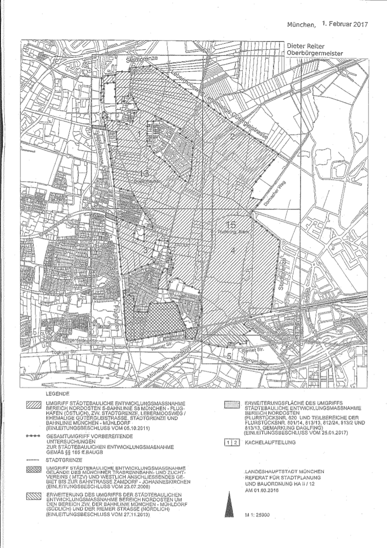 (1) Diese Satzung gilt für das Gebiet im Nordosten der Landeshauptstadt München, das im Wesentlichen zwischen der S-Bahnlinie S 8 München – Flughafen, der Bahnlinie München – Mühldorf, der östlichen Stadtgrenze und dem Lebermoosweg liegt. Für dieses Gebiet hat der Stadtrat der Landeshauptstadt München am 23.07.2008, am 05.10.2011, am 27.11.2013 und zuletzt am 25.01.2017 beschlossen, vorbereitende Untersuchungen nach § 165 Abs. 4 BauGB durchzuführen.
