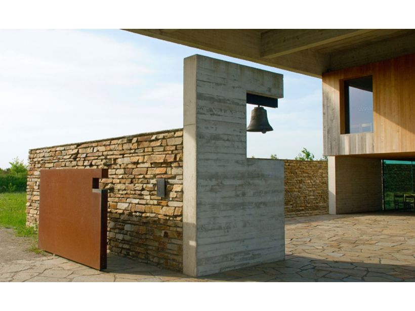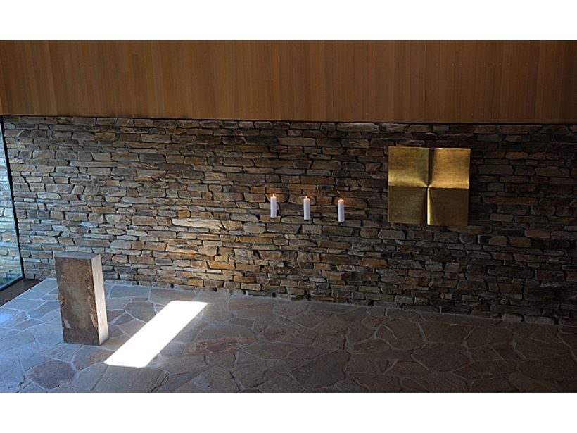 Auch im Innenraum wurde der Werkstoff Beton eingesetzt: Etwas besonderes ist die Materialkombination aus Eiche und Beton im Bereich des Aufbewahrungsgangs. Die hölzernen Schiebewände ruhen auf Sichtbetonbänken und schaffen eine ruhige und intime Atmosphäre, in der die Trauernden Abschied nehmen können. Die Oberflächen des Betons im Innenraum sind unterschiedlich gestaltet: in einigen Bereichen wurde der Sichtbeton mit einer Bretterschalung mit stark saugender Oberfläche erzeugt, der Abdruck der horizontalen Schalung nimmt dabei Bezug auf das Eichenholz; in anderen Bereichen, wurde der Beton nachträglich geschliffen.