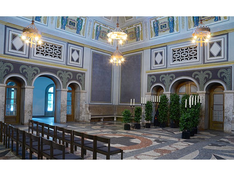Der Verabschiedungsraum fügt sich in die historische Architektur der Gebäude aus dem Jahr 1907 ein. Die Gestaltung ist schlicht und beschränkt sich auf das Wesentliche. Der Verabschiedungsraum kann sowohl für eine reine Verabschiedung als auch für eine Trauerfeier in kleinerem Rahmen genutzt werden.